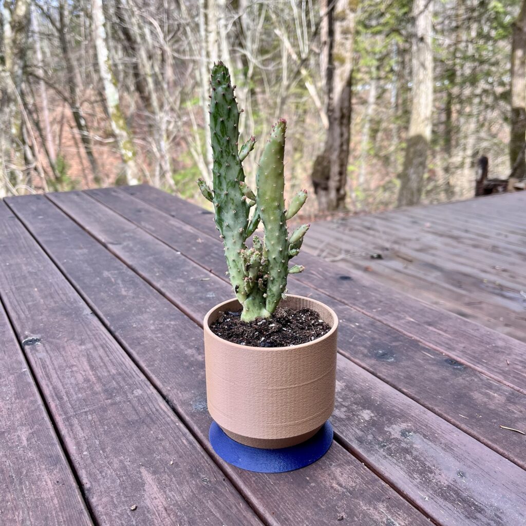 植木鉢を3Dプリンターで試作。一番下の円錐台に見える色が違う部分は水の受け皿になっている。これのラフなデザインをブラッシュアップしていこうと思ってる。